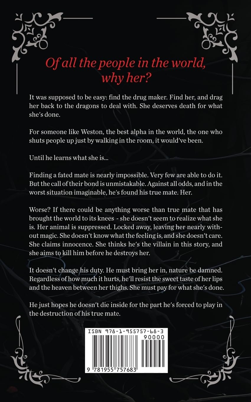 Worse? If there could be anything worse than a true mate that has brought the world to its knees - she doesn't seem to realize what she is. Her animal is suppressed. Locked away, leaving her nearly without magic. She doesn't know what the feeling is, and she doesn't care. She claims innocence. She thinks he's the villain in this story, and she aims to kill him before he destroys her.