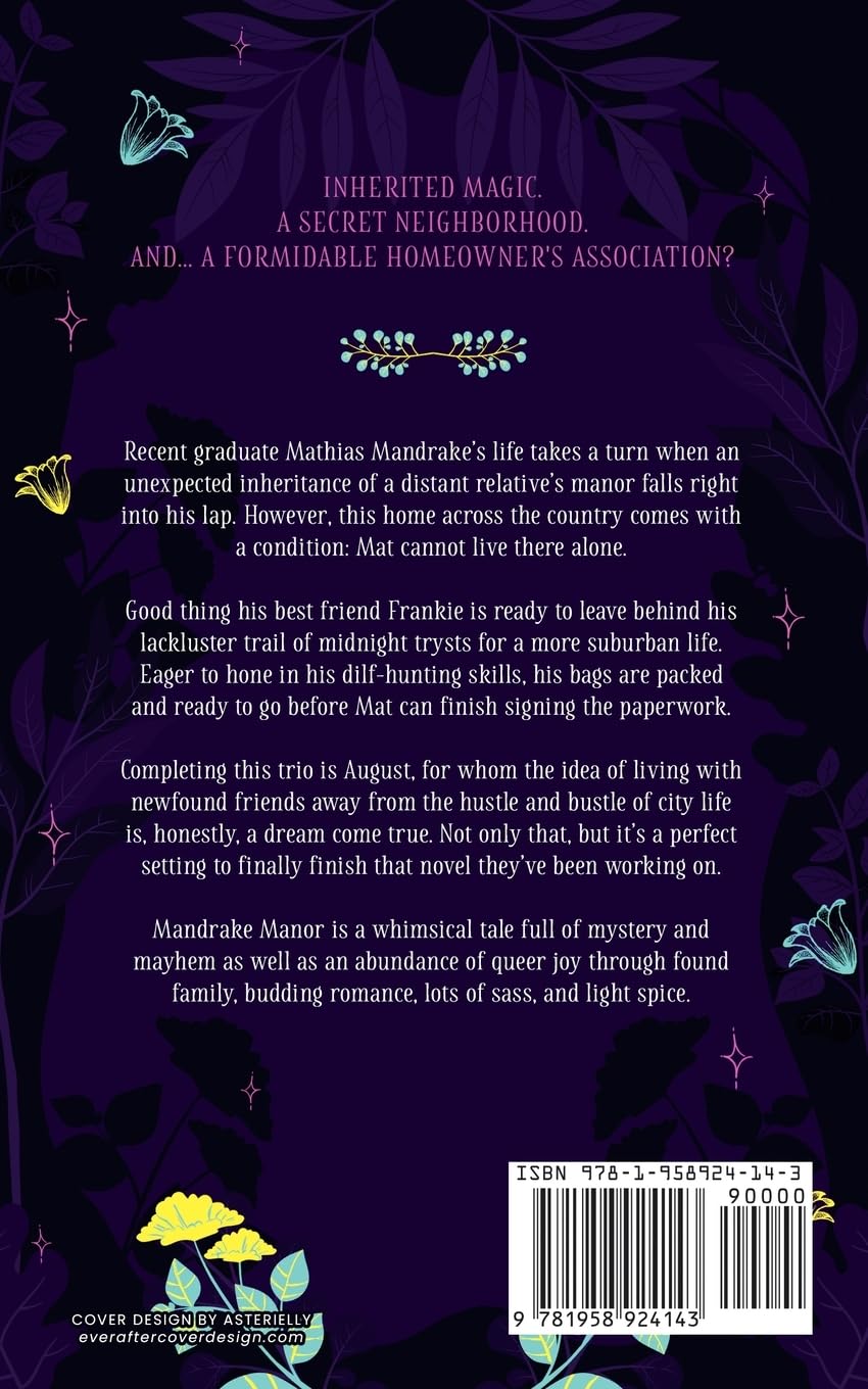 Mandrake Manor is a whimsical tale full of mystery and mayhem as well as an abundance of queer joy through found family, budding romance, lots of sass, and light spice.