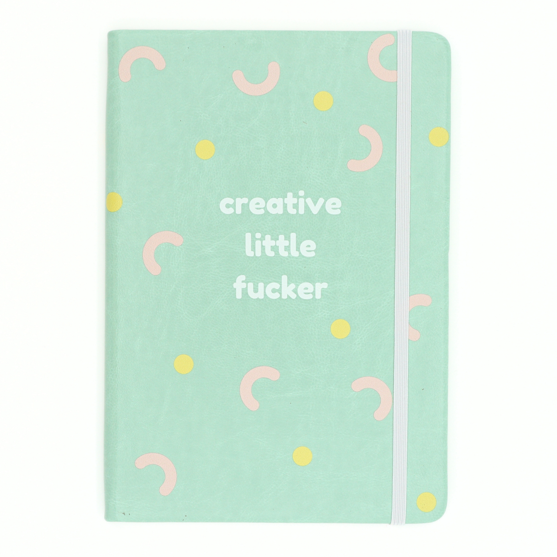 This padded A5 vegan light teal leather journal has a white elastic closure.