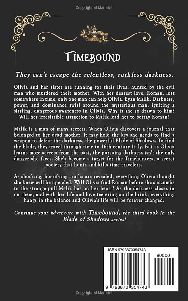 Malik is a man of many secrets. When Olivia discovers a journal that belonged to her dead mother, it may hold the key she needs to find a weapon to defeat the darkness, the powerful Blade of Shadows. To find the blades, they travel through time to 16th century Italy. But as Olivia learns more secrets from the past, the pursuing darkness isn’t the only danger she faces. She’s become a target for the Timehunters, a secret society that hunts and kills time travelers.