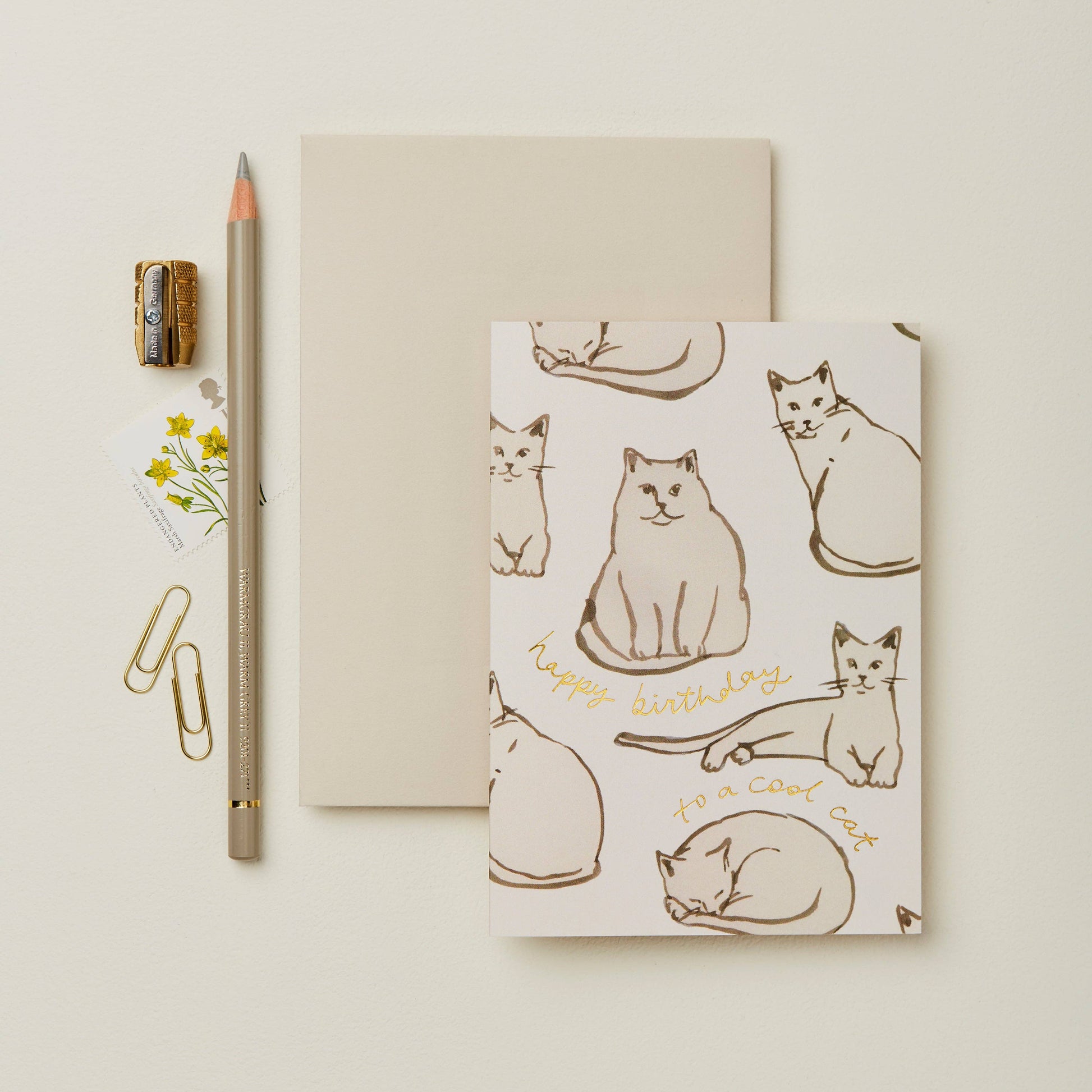 A cute little card for cat lovers, adorned with our feline friends and reading 'Happy Birthday to a cool cat'. All of our cards feature golden foil on the front and back of the card. Designed and printed in the UK on FSC certified papers.